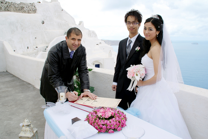 I chose Saint Irni because I love the its structure and location, it was facing the sea. We got to Saint Irni and our ceremony started. There was one camera man and two photographers (one is Nikos) recorded our whole ceremony. Saint Irni was very romantic, surrounded it was all white just like in dream land! I couldn’t believe that were are getting married in Santorini, everything I have dreamed all came true! Even though it was just two of us, I felt this was the best moment in my life that I will never forget.