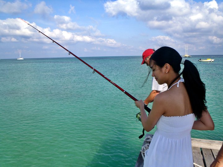 Today was our snorkeling day! Ever since I snorkeled in Bahamas few years ago, I love snorkeling! I booked an excursion with Jolly Pirates. We walked to MooMba Beach which is just between the Holiday Inn and the Marriott Resorts to the Jolly Pirates “office” inside the Jolly Pirates Skull and Crossbones Souvenir Shop. We signed the form and paid our trip – $100 for two of us. Since we were early, we walked to the departure port. Here we met this guy who was fishing and he was very nice to let me try haha!