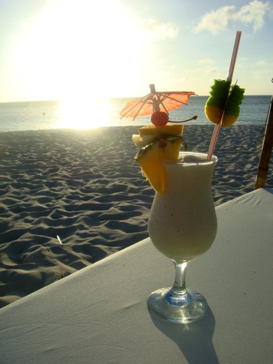 We ordered pina-colada, Aruban Seafood Soup (it was ok not as good as the Aruban Seafood Chowder I had during lunch), Perfect Match (grilled Mahi Mahi with baby scallops) and Grilled Filet Mignon. Our pina-colada came! Picture of my pina-colada with the sunset 🙂