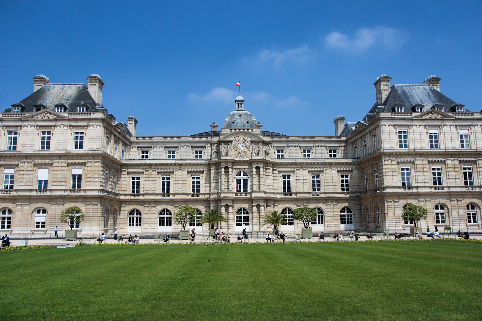 We walked down this street following the map. We found a great sandwich place just right in front of the entrance of the garden, very inexpensive and delicious for lunch! We ate sitting on the stairway haha but felt very Parisian 🙂 After our wonderful quick lunch, we walked into the garden. We saw family with their kids enjoying their time in the garden. Here I am in front of the Palais du Luxembourg: