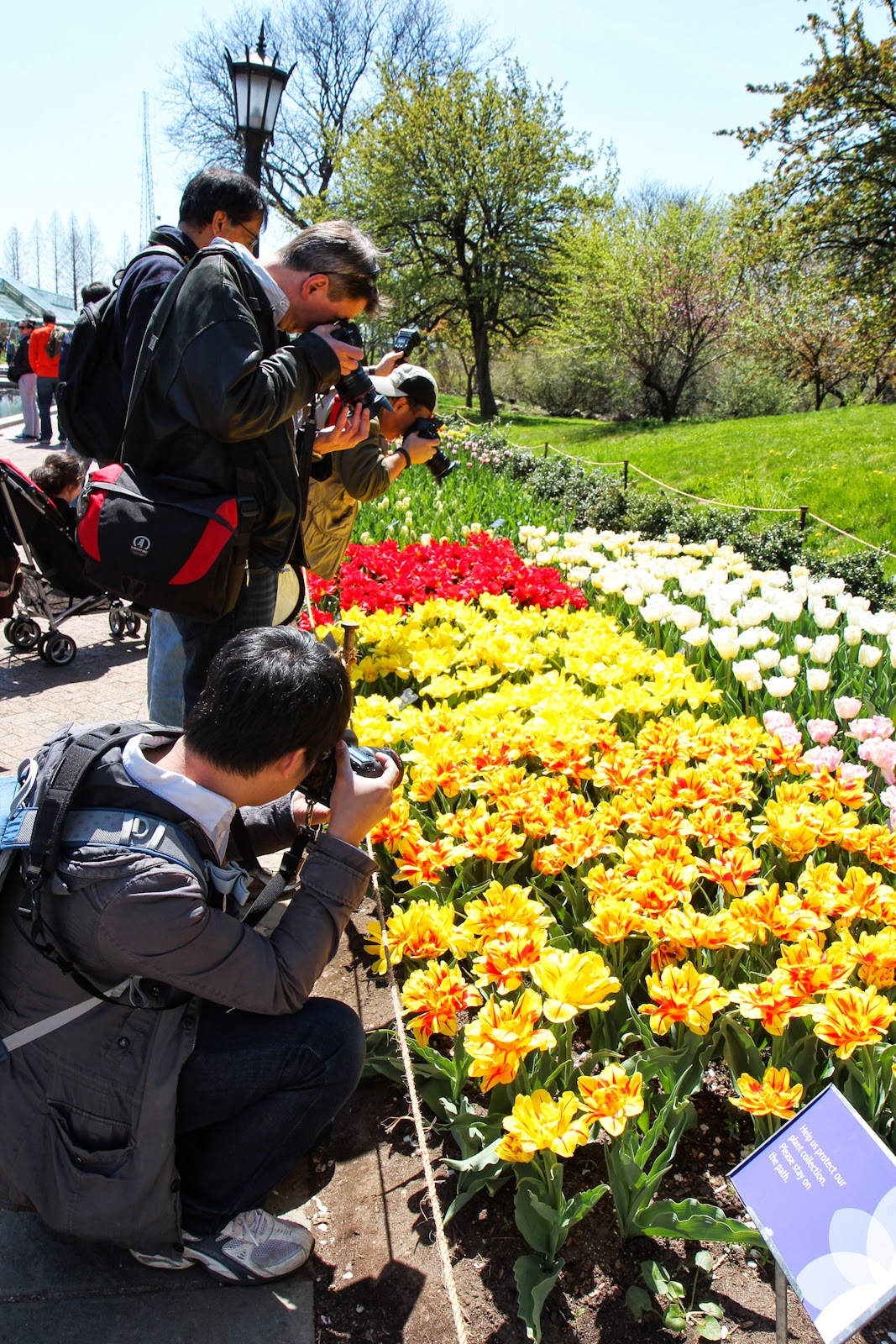 We walked down to the Lily Pool Terrace where tulips were in full bloom! There were so many varieties of tulips that I never seen or heard of. I started from the front of the row and took photos of each variety to the back, I think it took me at least half an hour to get through all of them. Plus it was so crowded with photographers like us LOL! Sometimes we had to wait to have a space to squeeze in! Here’s a photo I took of my husband fighting for room with other photographers hahahaha: