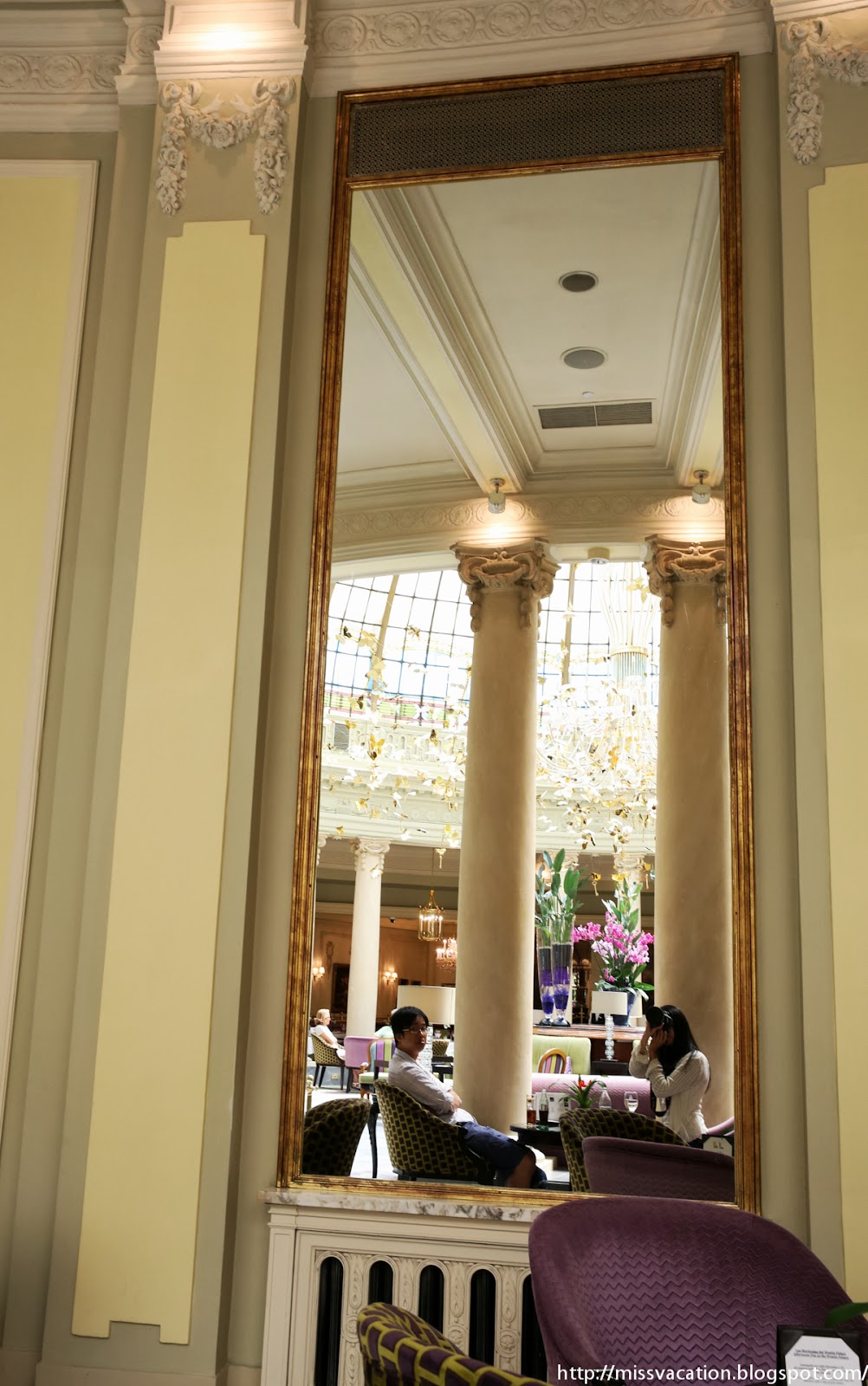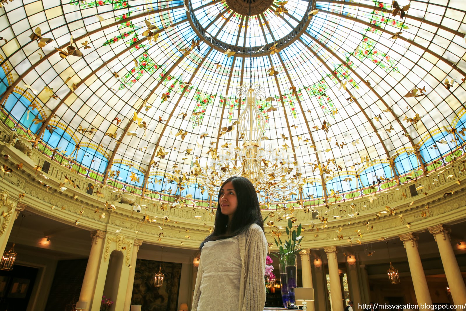 I walked into the restaurant and the huge stained glass dome with hanging birds and butterfly ornaments were spectacular. I also like the purple and green cushioned furniture added elegance to the restaurant…like in a royal room!