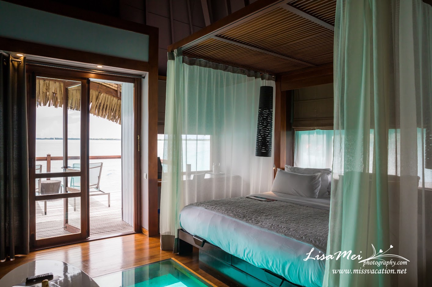 Once we opened the door, although the room is much smaller at only 593 sq. feet than the overwater bungalow at the Intercontinental Bora Bora Thalasso at 1,200 sq. feet, the huge glass floor stood out! Also, on the table are free gifts: a bottle of wine, a Le Meridien Bora Bora t-shirt, and a beach wrap (very good quality), wow!